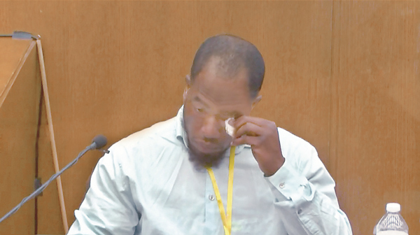 乔治·弗洛伊德事件目击证人、综合格斗拳手唐纳德·威廉姆斯几度哽咽,“我相信我目睹了一场谋杀”。(视频截图)(图片来源:视觉中国)