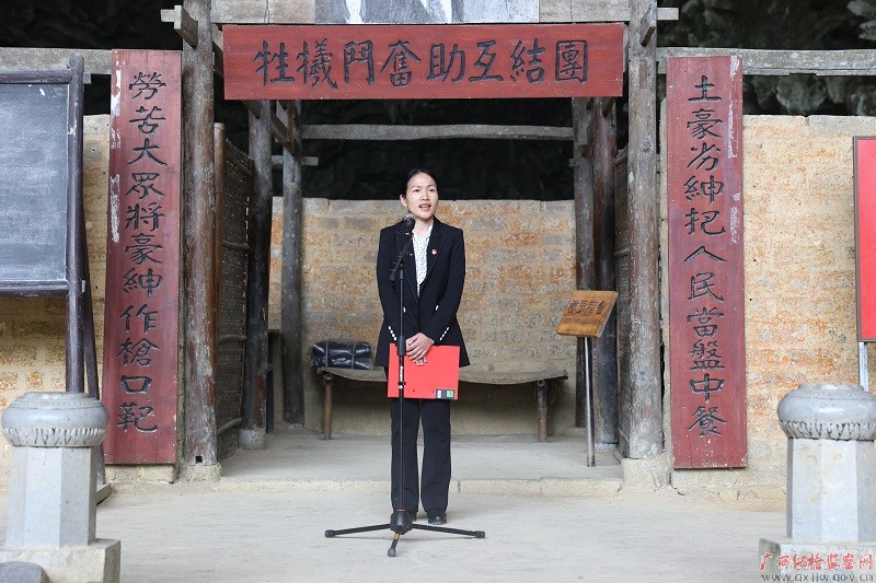 在东兰县列宁岩内的农民运动讲习所”,爷爷谭国联接触了马克思列宁主义,从此走上革命道路。图为在广西农民运动讲习所旧址,谭慧文向全市纪检监察干部讲述爷爷的红色故事。
