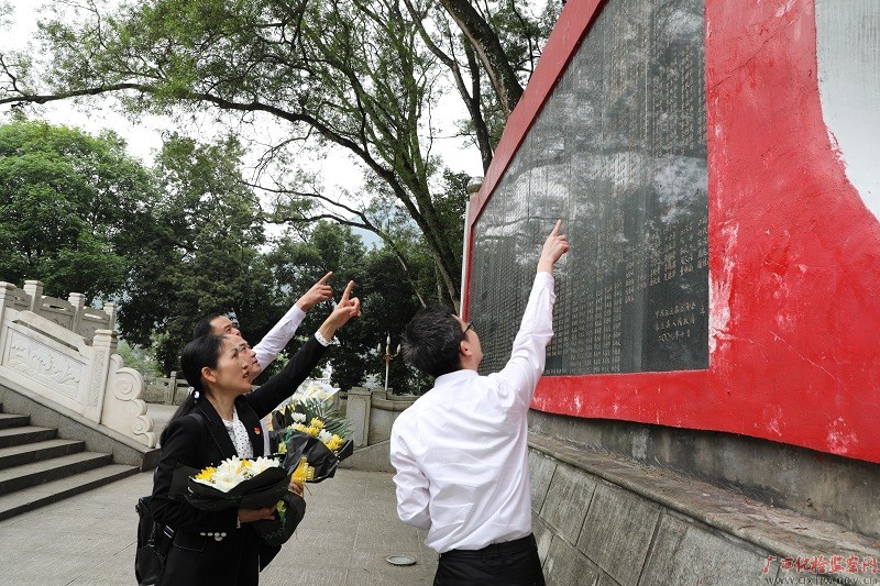东兰革命烈士纪念碑下,谭慧文和同事们在烈士名录中,寻找爷爷谭国联”的名字