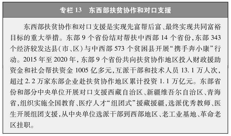 扶贫减贫是艰巨复杂的系统工程,需要调动各方积极参与。为打赢脱贫攻坚战,中国共产党依托严密组织体系和高效运行机制,广泛有效动员和凝聚各方力量,构建政府、社会、市场协同推进,专项扶贫、行业扶贫、社会扶贫互为补充的大扶贫格局,形成跨地区、跨部门、跨单位、全社会共同参与的多元主体的社会扶贫体系。加强东西部扶贫协作和对口支援(专栏13),推动省市县各层面帮扶,促进人才、资金、技术向贫困地区流动,实现优势互补,缩小区域差距。积极开展定点扶贫,组织各级党政机关、人民团体、国有企事业单位和军队帮扶贫困县或贫困村(专栏14)。各民主党派、工商联和无党派人士充分发挥各自优势,为打赢脱贫攻坚战献智献力。积极推动各行各业发挥专业优势,开展产业扶贫、科技扶贫、教育扶贫、文化扶贫、健康扶贫、消费扶贫。广泛动员民营企业参与扶贫开发,引导市场开发能力强的主体进入资源开发潜力大的地区,实现互惠互利、共同发展(专栏15)。广泛动员社会组织、公民个人积极参与脱贫攻坚,开展扶贫公益活动。设立国家扶贫日,建立脱贫攻坚国家荣誉制度,表彰脱贫攻坚先进典型,营造了人人愿为、人人可为、人人能为的社会帮扶氛围。