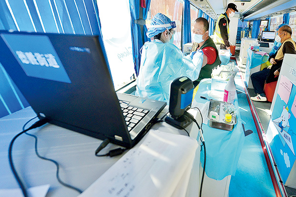 北京西城,居民在移动新冠疫苗接种车上接种疫苗(图片来源:视觉中国)