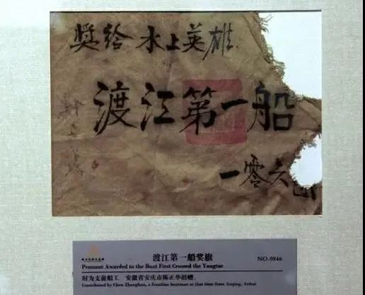 渡江战役纪念馆里收藏有一面特殊的旗帜,黄色旗面上写有“奖给水上英雄”,中间为“渡江第一船”5个大字,落款为“一零六团”。这面锦旗,是村民陈正华父子运送解放军战士渡江的见证。