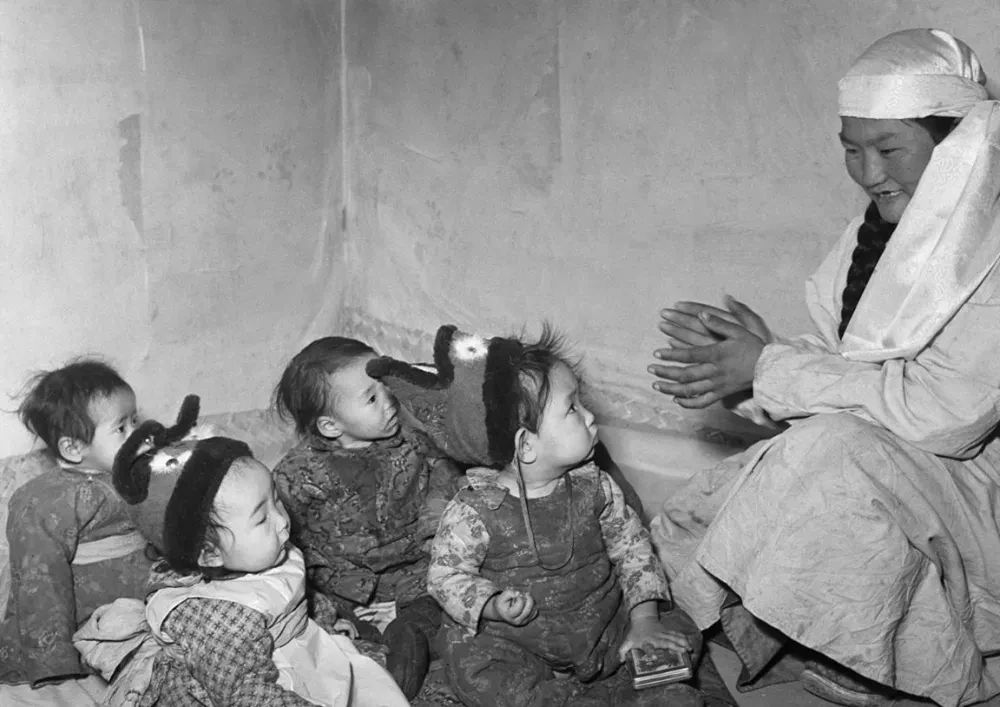 这是内蒙古巴音策勒牧业社的保育员和幼儿们玩耍(资料照片)。新华社发