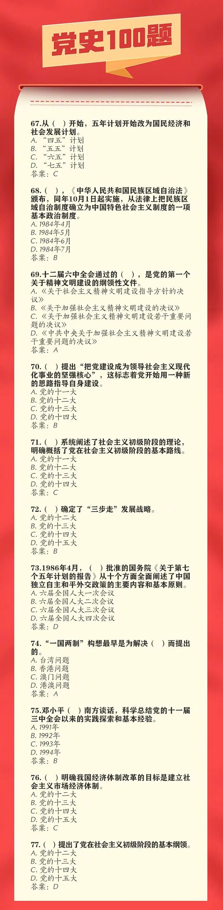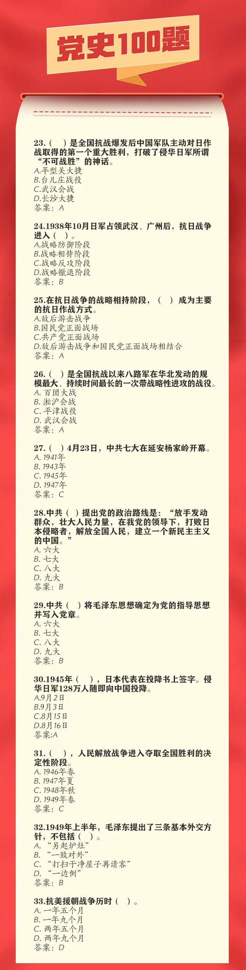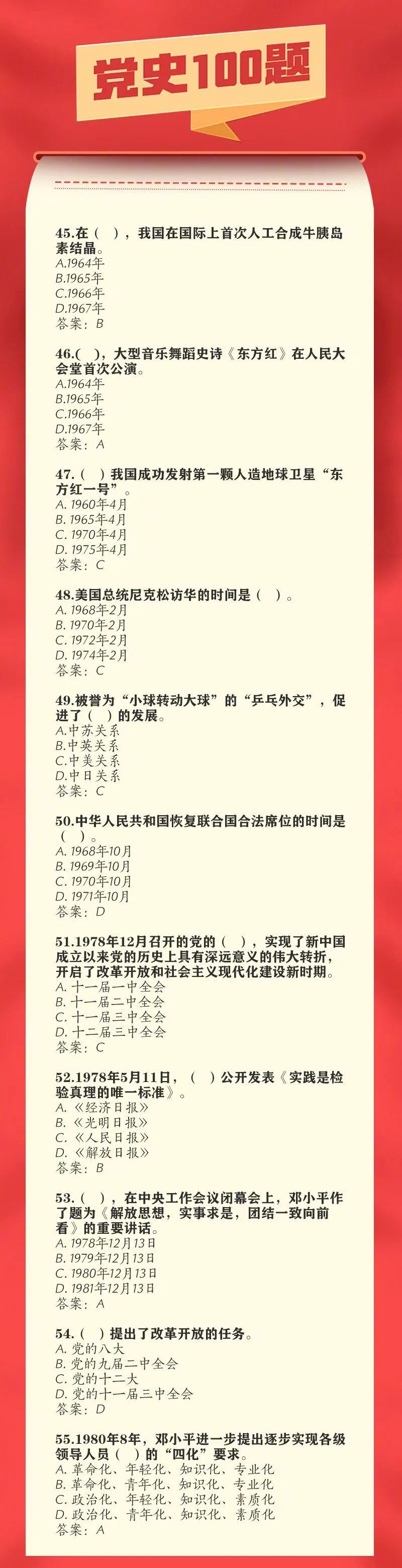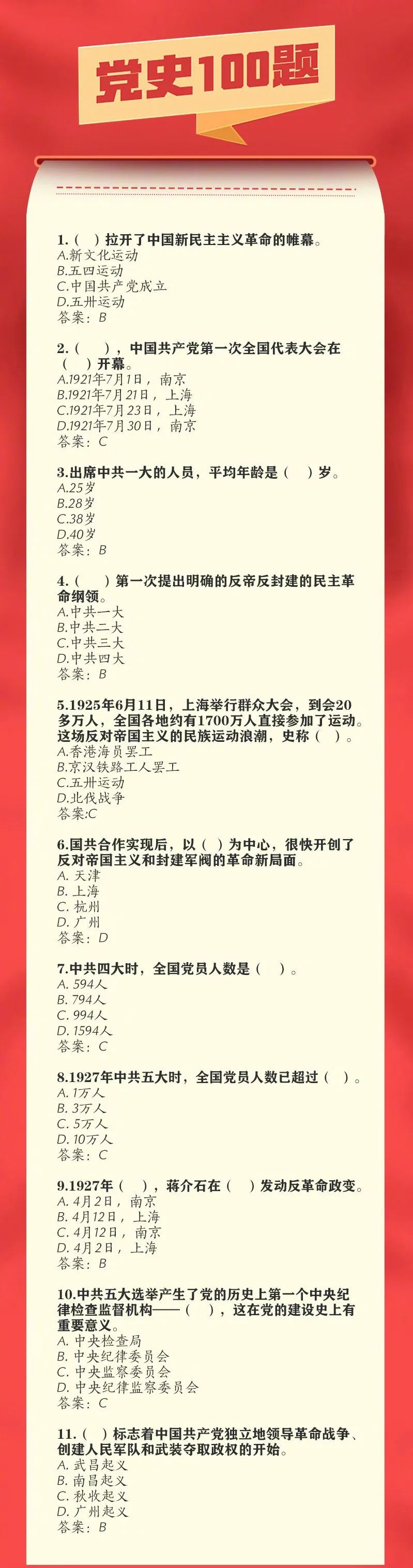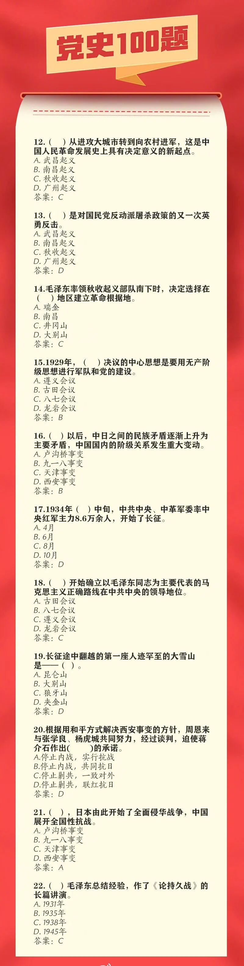 百年党史100题,你会做几道?你知道出席中共一大的人员平均年龄是多少岁吗?中共党员是何时超过1000万人的?我国的改革开放由哪次会议揭开序幕?……无论我们走得多远,都不能忘记来时的路。话不多说,戳图学习。