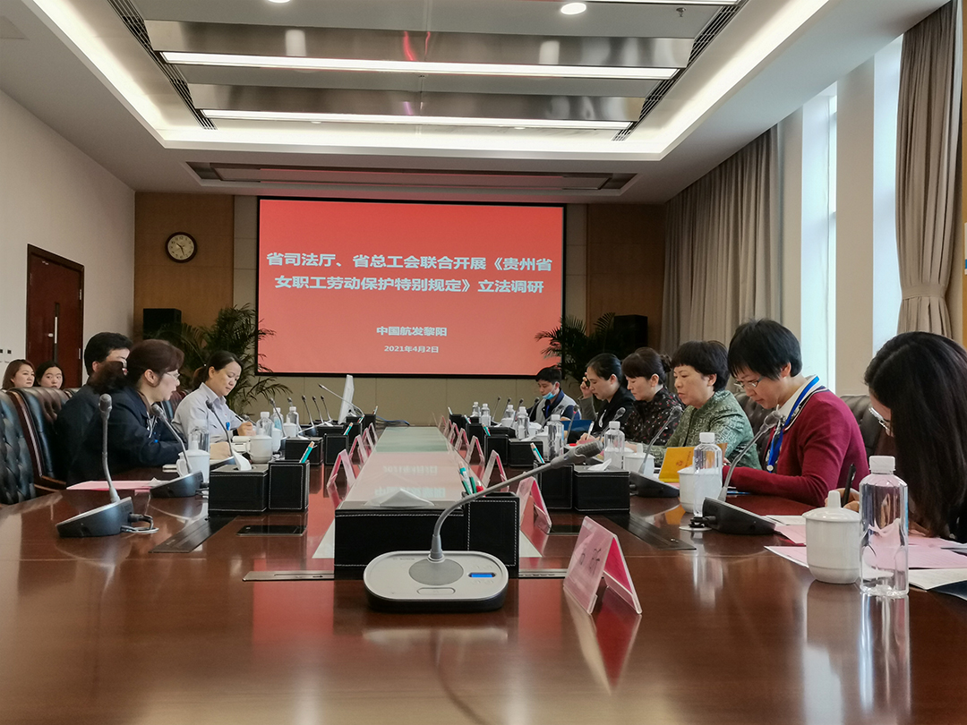 为推进《贵州省女职工劳动保护特别规定(草案)》立法工作,4月2日,由省司法厅党委委员、副厅长胡勇和省总工会副主席魏俊带队,省司法厅、省总工会、贵州大学法学院有关人员组成立法调研组,赴黎阳航空动力有限公司开展立法调研。省司法厅立法一处参加调研。