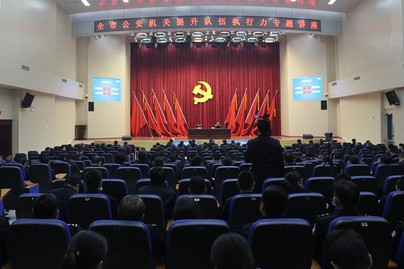 全市公安机关民警辅警职工分别在主会场、分会场聆听讲座。