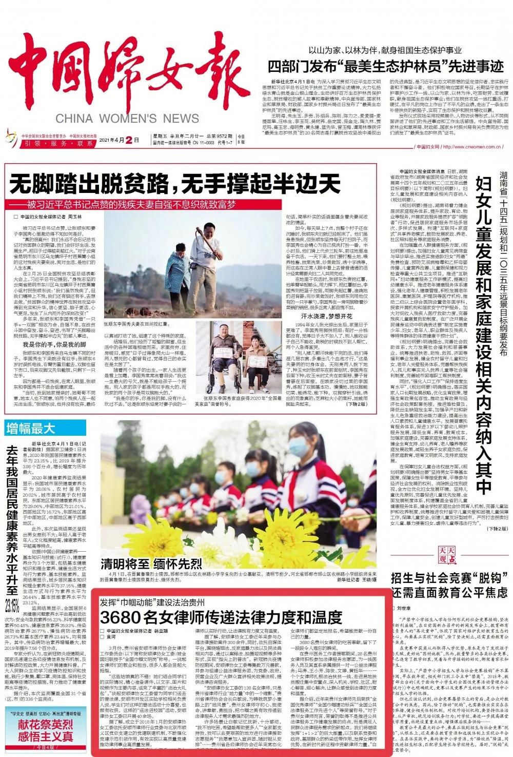 本文于4月2日刊登于中国妇女报头版,先后转发至学习强国平台,中华全国妇女联合会官网、国务院妇女儿童工作委员会官网。