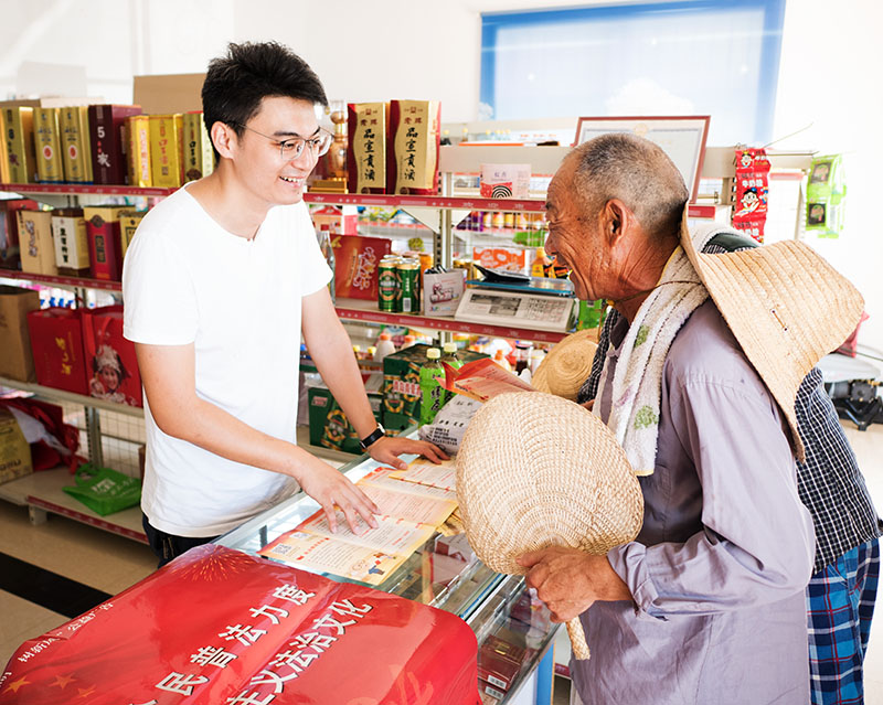 安徽省宣城市“法治家庭”成员向进店购物的群众普及法律知识。王朗 摄