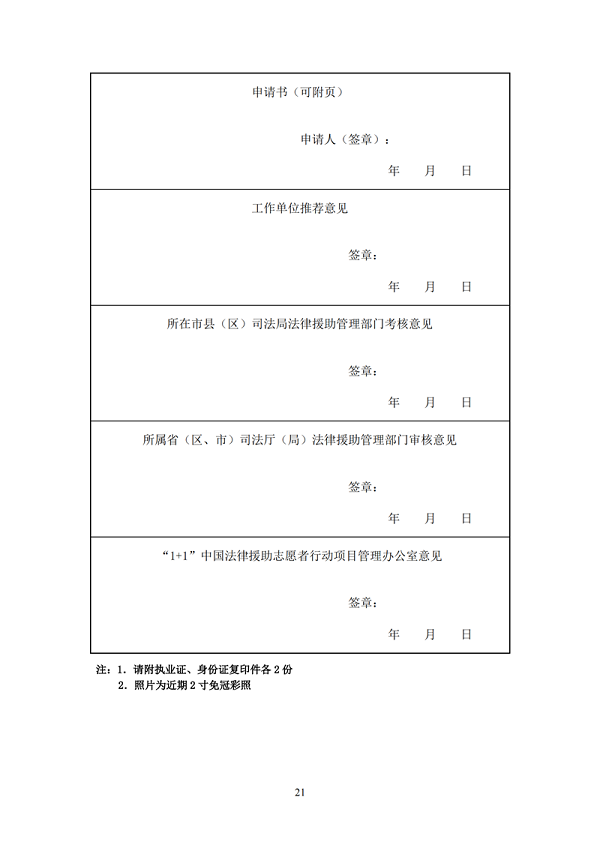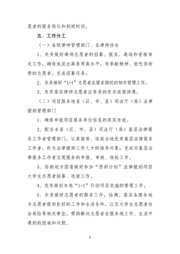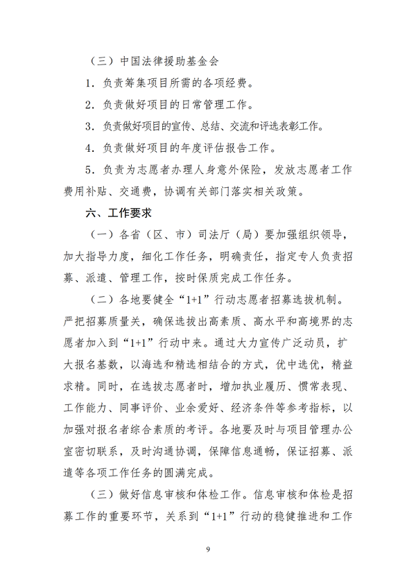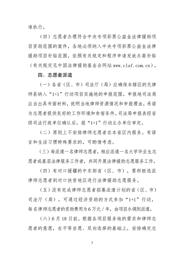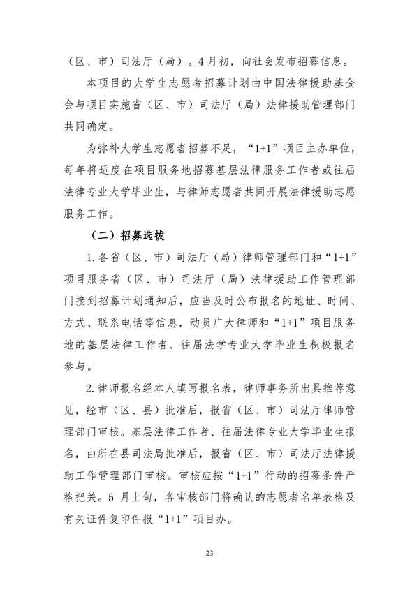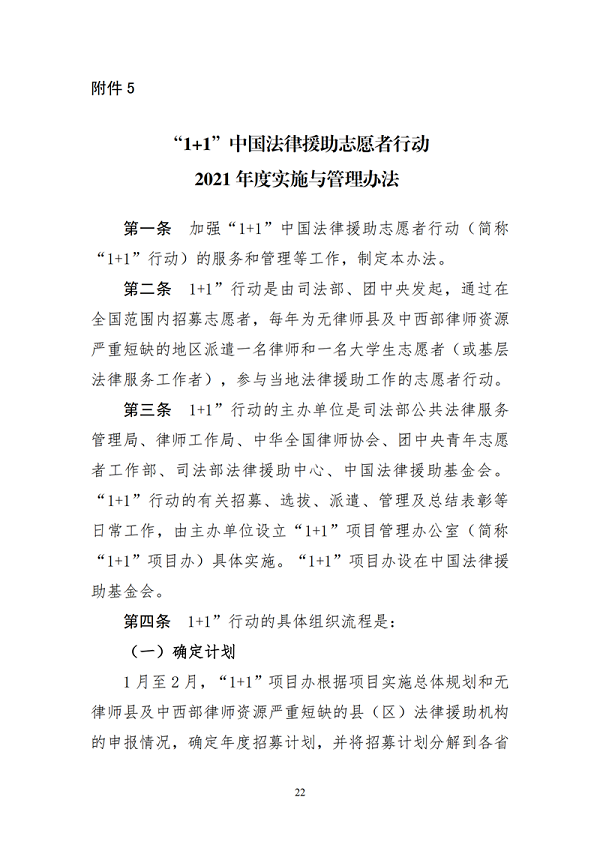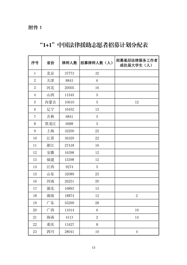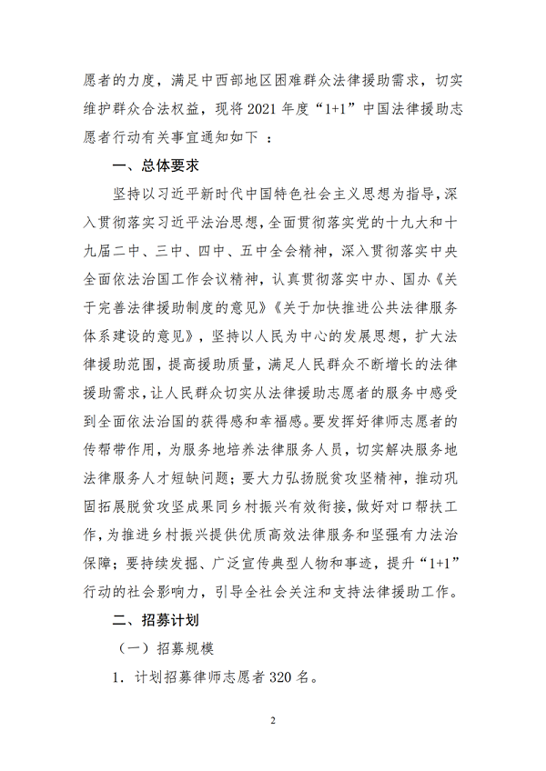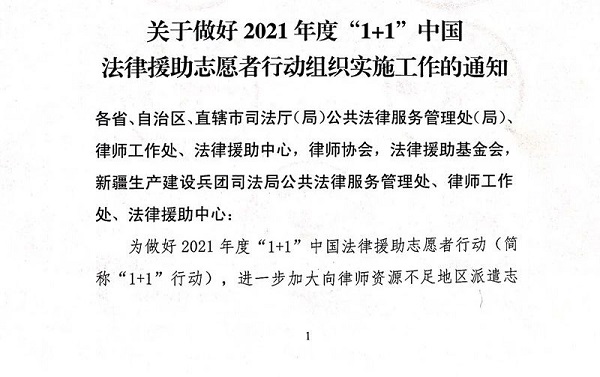 根据司法部公共法律服务管理局、司法部律师工作局、司法部法律援助中心、中华全国律师协会、中国法律援助基金会《关于做好2021年度“1+1”中国法律援助志愿者行动组织实施工作的通知》(法援基联发[2021]3号)的通知要求,为了认真做好我省2021年度“1+1”中国法律援助志愿者行动(以下简称“1+1”行动)工作,进一步加大向律师资源不足地区派遣志愿者的力度,保证困难地区群众法律援助需求与合法权益,现将2021年度“1+1”中国法律援助志愿者行动先关事宜通知如下: