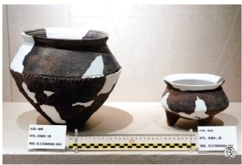 图③:河南省巩义市河洛镇双槐树遗址出土的陶罐(左)、陶鼎。 新华社记者 李安 摄
