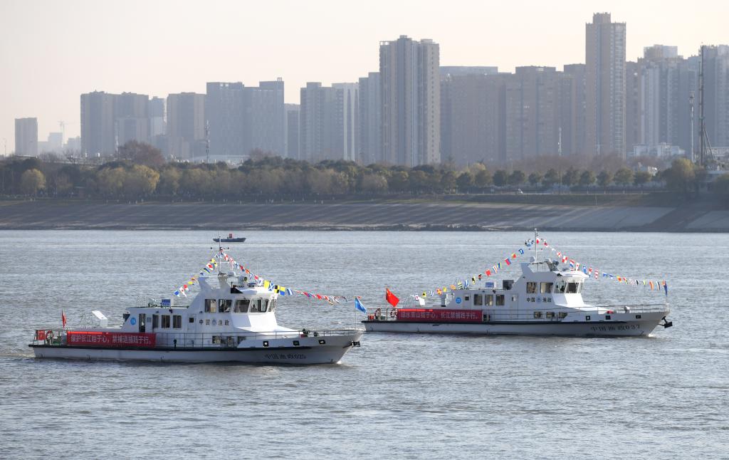 渔政执法船队从长江武汉段江面驶过(2020年12月31日摄)。新华社记者 程敏 摄