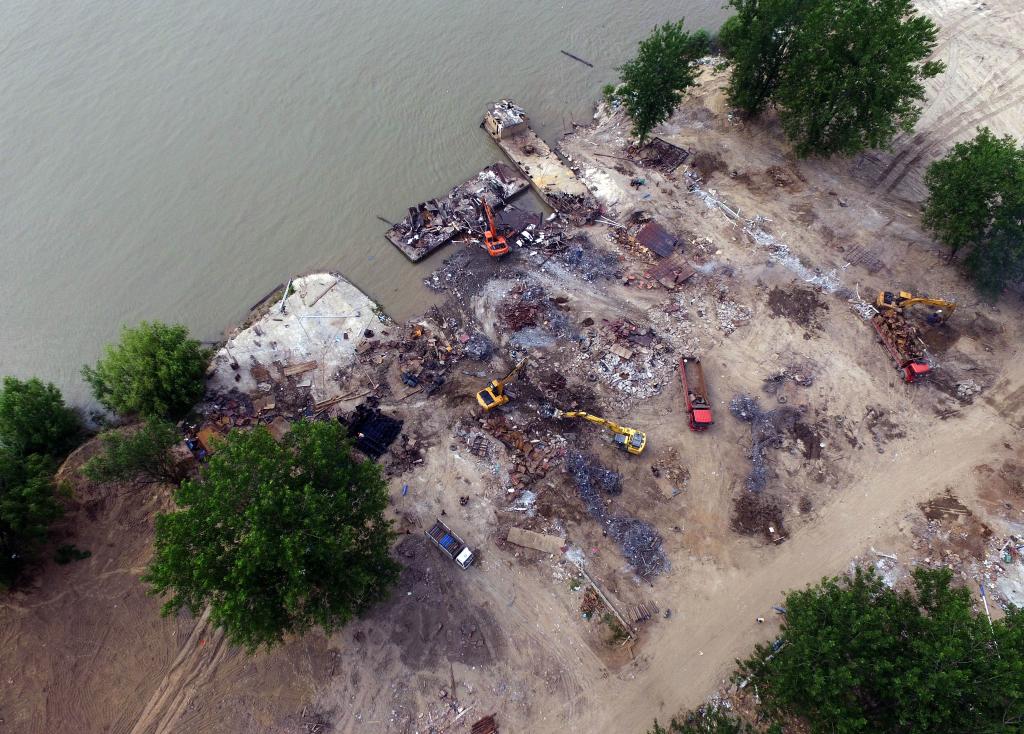 2016年5月18日,工作人员在武汉余家头非法码头整治清理现场进行收尾工作。新华社记者 程敏 摄