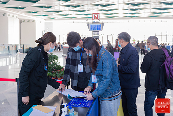 江苏省高邮市纪委监委对司法局、应急管理局、教体局等职能单位和部门开展明察暗访。图为明察暗访组成员在高铁站检查危险品核查、收缴、处置情况,以及 国家安全法等法律常识宣传情况。(江苏省高邮市纪委监委供 欧阳书兰 摄)