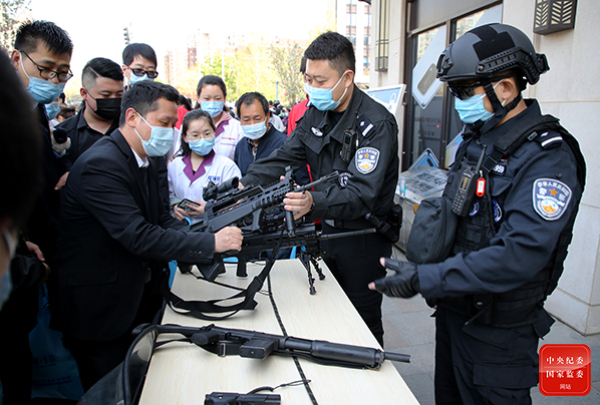北京市海淀区委政法委(国安办)组织公安、卫健、教委、体育等单位,以线上线下的方式开展安全知识宣传教育活动,增强群众国家安全意识。图为公安海淀分局正在向群众介绍反恐安全知识。(北京市海淀区纪委监委供 朱达焜 摄)