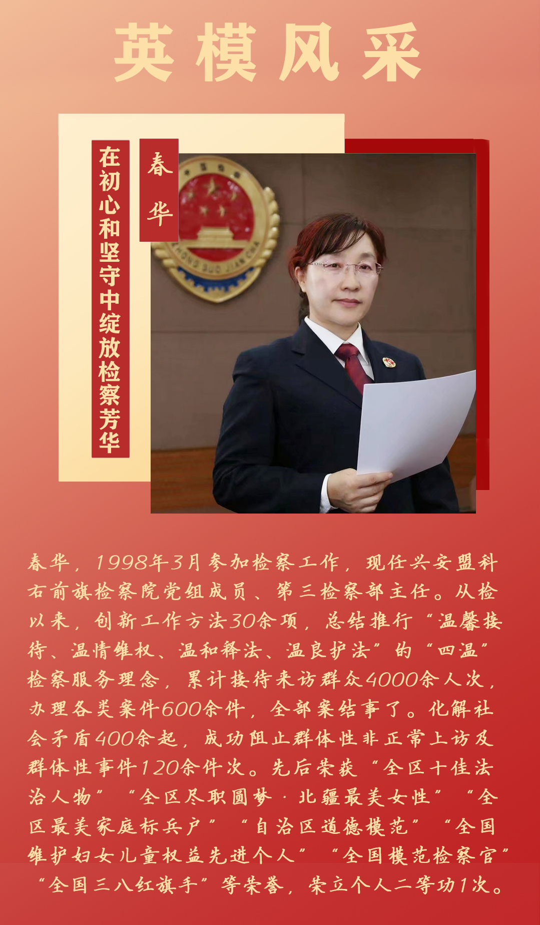 岁月无声,奉献无价,20多年的芳华,限量版的青春里写满了春华对检察事业的无限忠诚,对人民群众的真诚热爱!春华,这位来自草原的基层检察官,20多年的检察生涯,带着满腔热诚,足迹遍布了科右前旗1.7万平方公里的200多个嘎查村,用女性细腻、感性的特质,用初心和坚守串联着无数来访群众的殷切期盼,把时间跑成了一条线,把尊重、理解、爱护的为民情怀和依法、担当、负责的检察使命融入到每一访、每一案中,将司法阳光洒向了检察工作覆盖的每一寸土地,让人民群众真真正正从心底深处感受到了法律的公平正义。