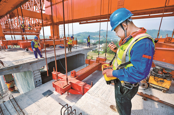 图③:近日,我国“八纵八横”高速铁路主通道上的贵南高铁银坡河特大桥节段梁全部架设完成,工作人员在进行架梁作业。新华社记者 刘续 摄
