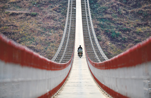图②:贵州省威宁彝族回族苗族自治县玉龙镇村民骑行在“溜索改桥”后的新桥上。新华社记者 杨文斌 摄