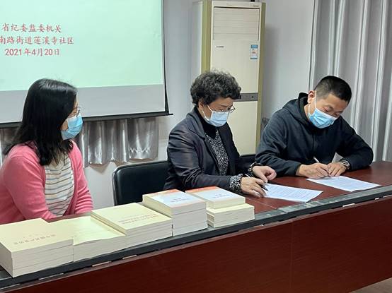 赠书仪式后,卢梅同志代表省纪委监委机关党委与莲溪寺社区签订了《党建结对共建协议书》,就党建联建、共同管理好下沉党员、活动共办、困难共帮等问题进行了明确,与社区党组织的党建工作优势互补、共同提高。