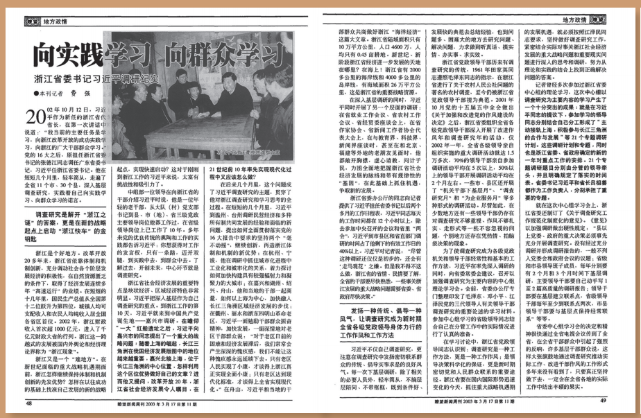 半年后的2003年3月全国两会前夕,费强专访了已任浙江省委书记的习近平,为当年第10期《瞭望》采写了《浙江省委书记习近平:双轮驱动提速发展》一稿。