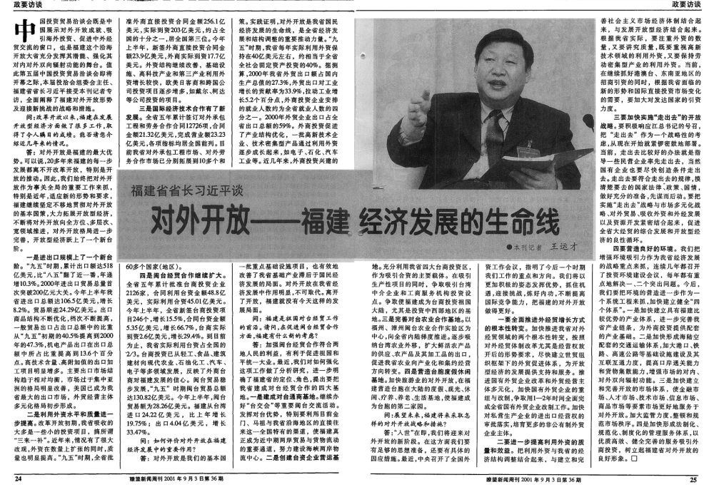 2001年9月3日,《瞭望》再次刊发专访报道《福建省省长习近平谈:对外开放——福建经济发展的生命线》。