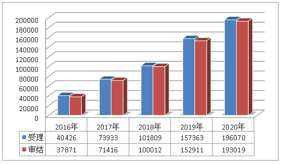 2020年,全省法院受理各类知识产权案件196070件,同比增长24.6%;审结193019件,同比增长26.1%。其中,受理民事案件194390件、刑事案件1663件、行政案件17件。受理一审案件177162件、二审案件17719件、申诉审查案件1135件、再审案件54件。
