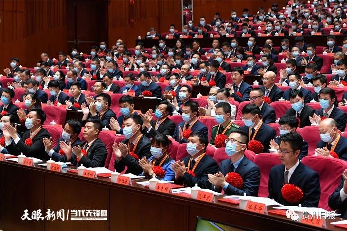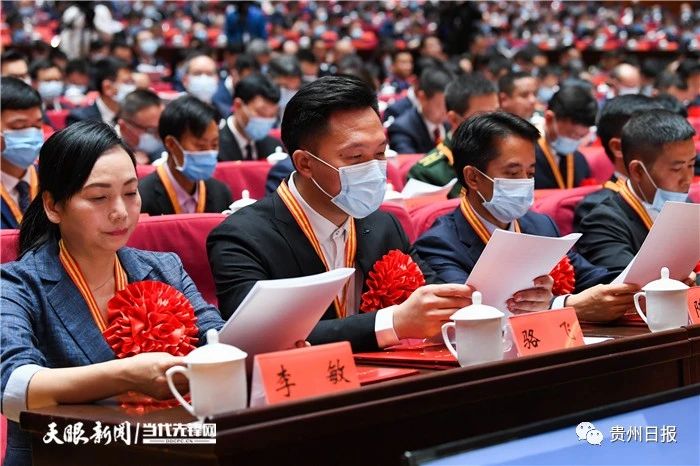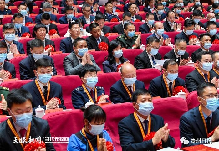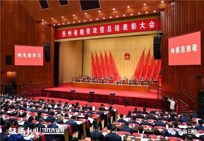 会场内气氛隆重热烈,两侧大屏幕上“向先进学习 向模范致敬”金色大字格外醒目。上午10时许,大会开始。雄壮的《义勇军进行曲》响彻会场,全场起立高唱国歌。随后,蓝绍敏宣读了《中共贵州省委 贵州省人民政府关于表彰全省脱贫攻坚先进集体和先进个人的决定》,决定授予贵阳市委办公厅等1000个集体“贵州省脱贫攻坚先进集体”称号,授予刘明兰等1500名同志“贵州省脱贫攻坚先进个人”称号。谌贻琴、李炳军、刘晓凯、蓝绍敏等省领导为受表彰的先进个人和先进集体代表颁奖。