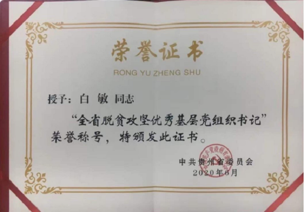 白敏同志自担任贵州省律协党支部书记以来,深入全省9个市(州)20个极贫乡镇多次走访调研,先后带领全省法律援助志愿者律师到毕节市威宁县石门乡、安顺市镇宁县简嘎乡、黔东南州从江县加勉乡、榕江县定威乡等地开展法治扶贫宣讲和法治扶贫工作,切实把贫困群众急需的法律知识、法律服务送到田间地头、送到农户家中,积极为当地党委政府提供制定脱贫攻坚政策、措施等方面的法律服务。