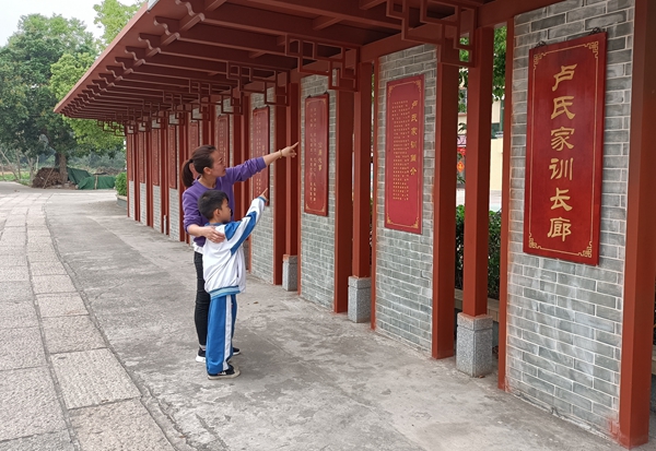 龙甫镇龙头村村民在卢氏家训长廊前教导孩子诵读家规家训。