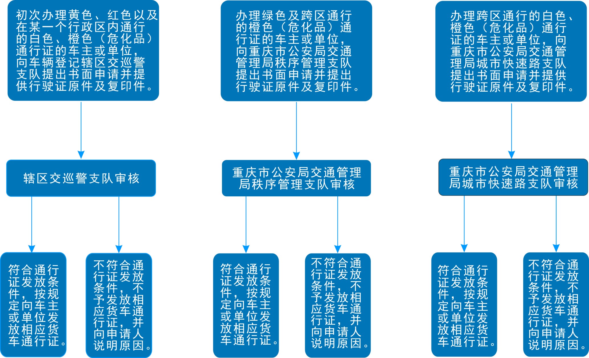 需办理通行证的车辆所有人,应按照通行证办理相关规定通过互联网申请端或主城区通行证办理窗口向公安机关交通管理部门提出申请,公安机关交通管理部门自受理申请之日起3个工作日内,对符合申领条件的,应当发放相应的货车通行证,并做好相关记录;对不符合申领条件的,应当说明理由。