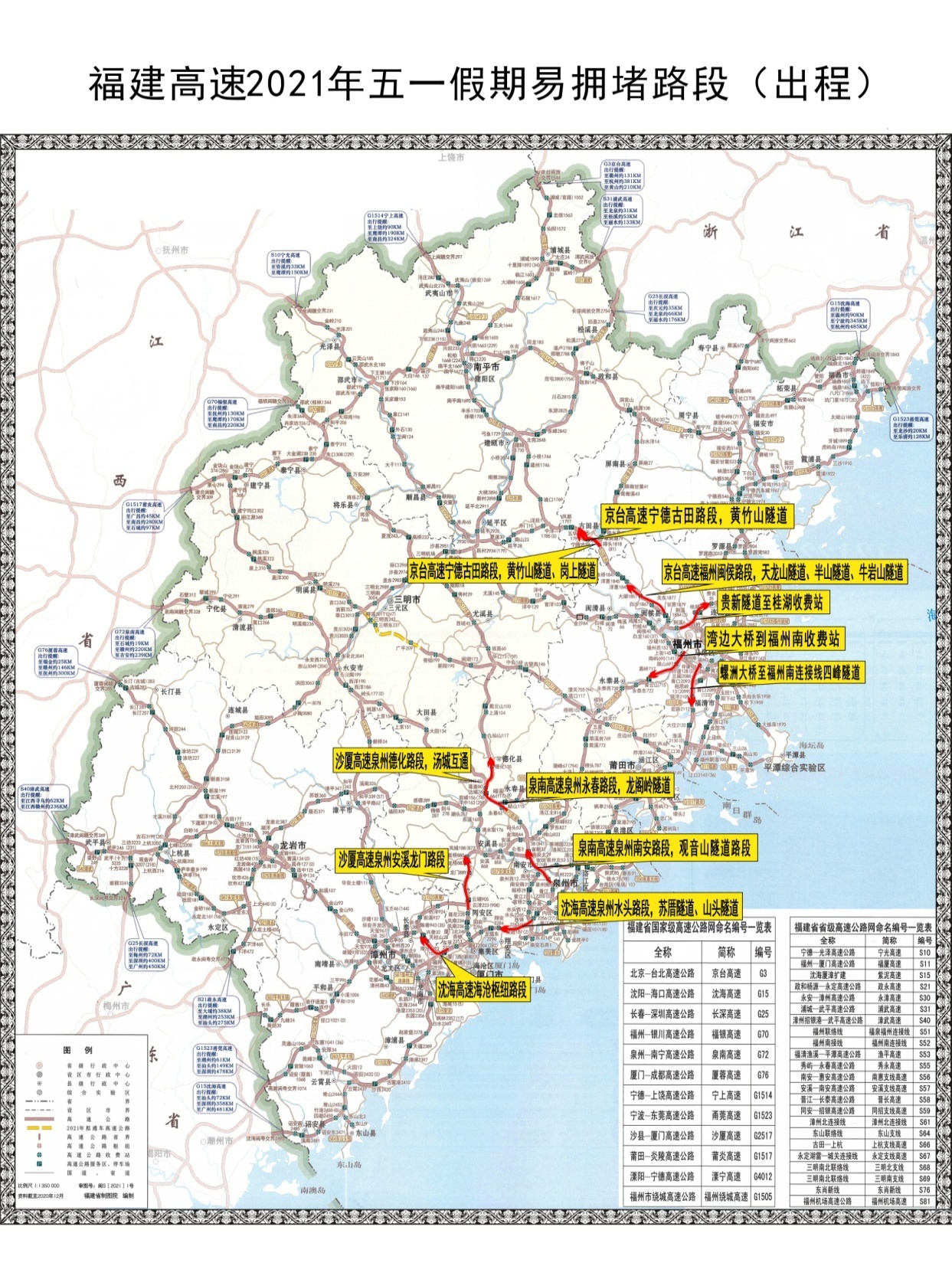 (一)14处易发缓行拥堵高速路段:分布在六条高速公路,即京台高速福州闽侯、宁德古田段,泉南高速泉州南安、永春、三明永安段,沈海高速泉州南安、厦门海沧、漳州漳浦段,厦蓉高速龙岩上杭至长汀段,甬莞高速泉州安溪、漳州南靖段,福银高速福州闽侯、三明将乐段,福州南连接线闽侯段等。