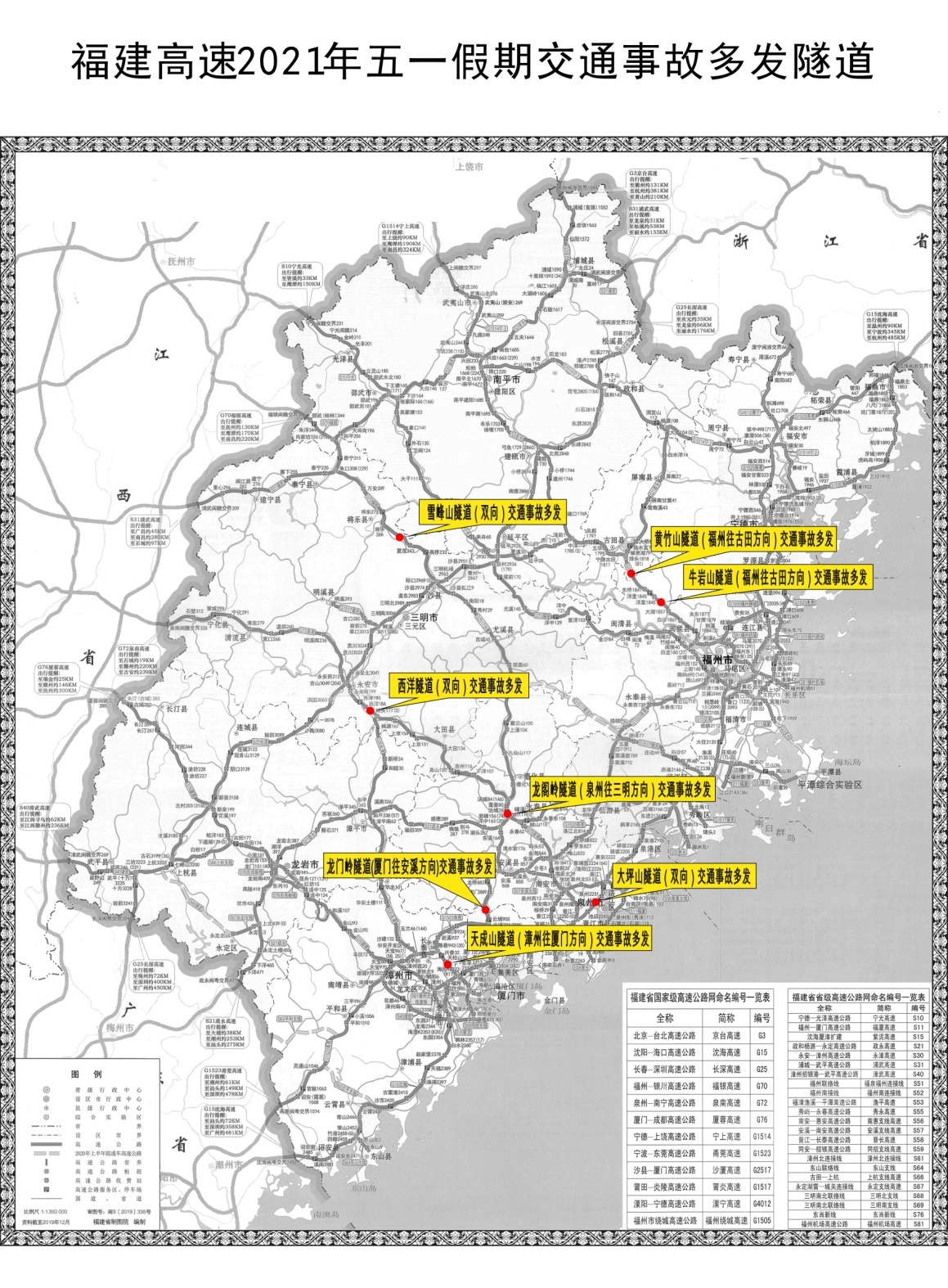(三)8处易发事故高速公路隧道:京台高速牛岩山隧道(福州往古田方向)、沈海高速大坪山隧道、泉南高速龙阁岭隧道(泉州往三明方向)、沙厦高速龙门岭隧道(厦门往安溪方向)、厦蓉高速天成山隧道(漳州往厦门方向)、泉南高速西洋隧道、福银高速雪峰山隧道、京台高速黄竹山隧道(福州往古田方向)。