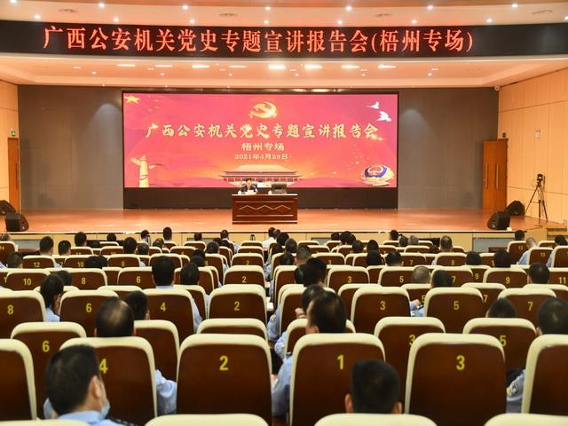 为深入学习贯彻习近平新时代中国特色社会主义思想,推动党史学习教育各项工作扎实开展,营造“学党史、悟思想、办实事、开新局”的浓厚氛围,4月27、28日,自治区公安厅党史主题宣讲团由区厅警令指挥部政委许绍明率队到梧州市公安局开展党史专题调研座谈和宣讲报告活动。市局党委副书记、副局长劳高进作宣讲报告会主持。