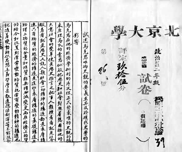 展览中展出了1923年北大政治系二年级学生贺廷珊的一份试卷,这份试卷是一篇论文——“试述马克思唯物史观的要义并其及于现代史学的影响”,字迹工整,全文不分段,只用顿号断句,不用新式标点。贺廷珊在论文中认为“自有马氏唯物史观,才把历史学提到与自然科学同等的地位,此等功绩,实为历史界开一新纪元,也是影响于史学上最大之点”,结尾盛赞“马氏真不愧为纪元人”。
