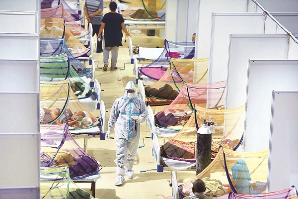 图为印度新德里市内的一个临时新冠患者护理中心。该国新增新冠确诊病例数和新增死亡病例数连续刷新纪录,疫情持续恶化。(图片来源:人民视觉)
