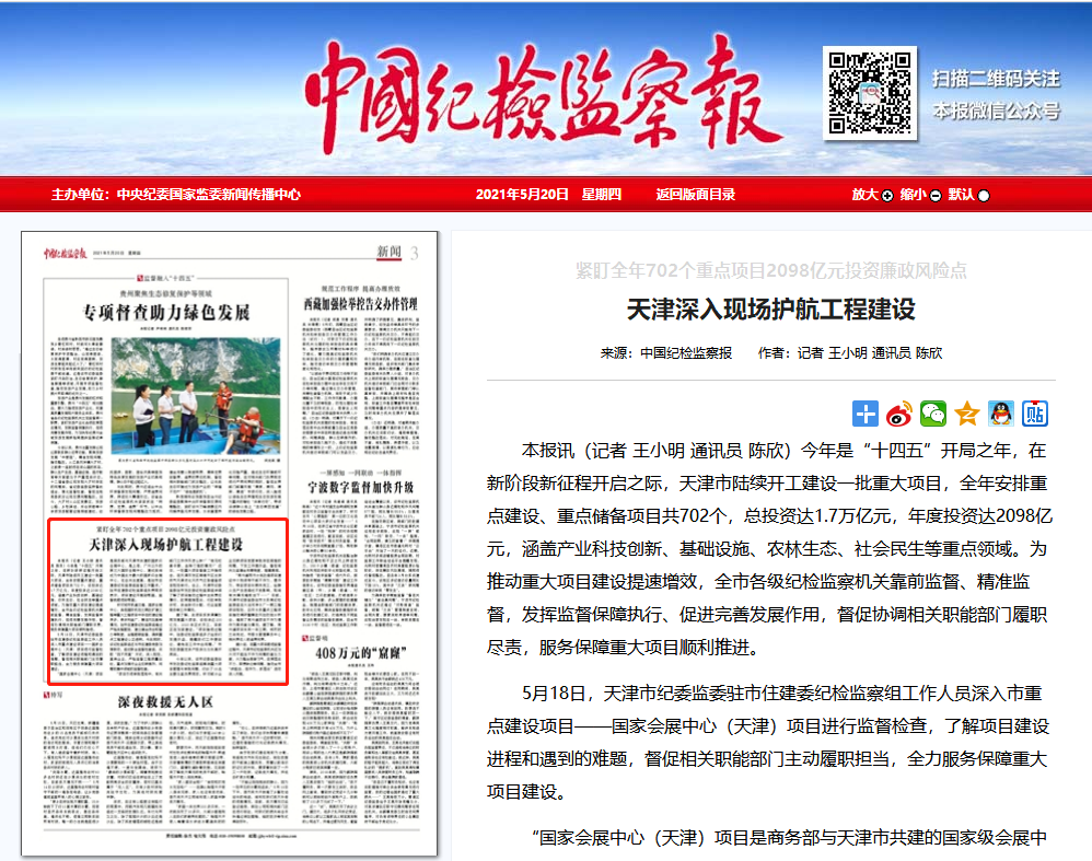 “国家会展中心(天津)项目是商务部与天津市共建的国家级会展中心,是上海、广州之外的第三大国际会展中心,建成后将成为中国北方最大的国家级会展中心,社会关注度高,是驻市住建委纪检监察组监督工作重点。”驻市住建委纪检监察组负责同志表示,项目建设开展到哪里,监督就跟进到哪里。