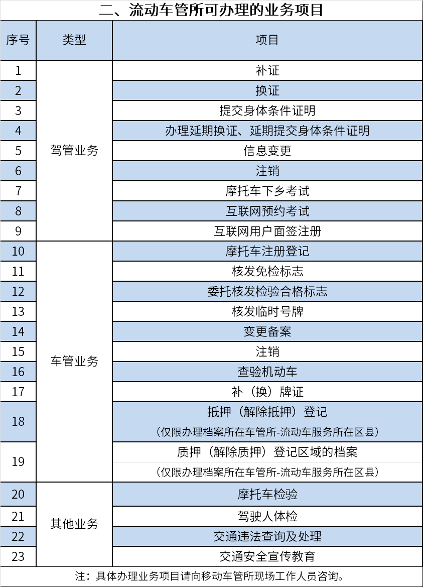 为方便驾驶人办理补(换)证、变更备案、抵押(解除)登记、摩托车检验等车驾管相关业务,根据群众需要,交巡警总队制定了流动车管所2021年6月服务计划,共组织24场车驾管上门服务,请市民根据业务办理需求,查看服务时间,按时前往办理相关业务。