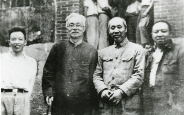 林伯渠(左二)和钱之光、董必武、王若飞在重庆八路军办事处。(资料图片)