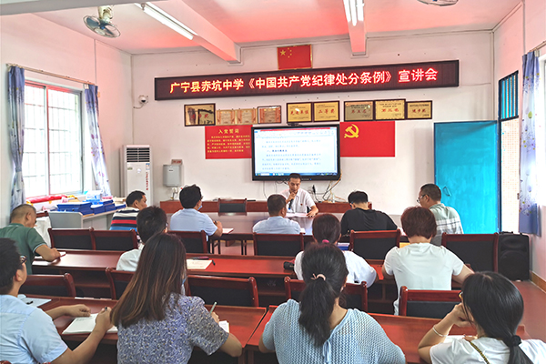 为进一步加强师德师风建设,营造校园清风正气,今年5月以来,肇庆市广宁县纪委监委组织纪检监察干部深入全县各学校,通过组织观看警示教育片、深入剖析身边人违纪违法典型案例、详细解读《中国共产党章程》《中国共产党纪律处分条例》《中华人民共和国监察法》等举措,教育引导学校教职工自觉用党纪法规规范言行举止,进一步筑牢拒腐防变思想道德防线,以实际行动树立高尚师德,做到廉洁从教。图为广宁县赤坑镇纪检监察干部正在向教职工宣讲党纪法规。