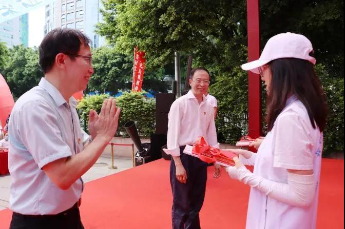 在现场群众的见证下,十名省直单位领导共同触屏启动2021年福建省“美好生活・民法典相伴”主题宣传活动。随后,省司法厅副厅长黄岩生与省文旅厅副厅长肖长培为福建省“蒲公英”普法联盟志愿者代表赠书。