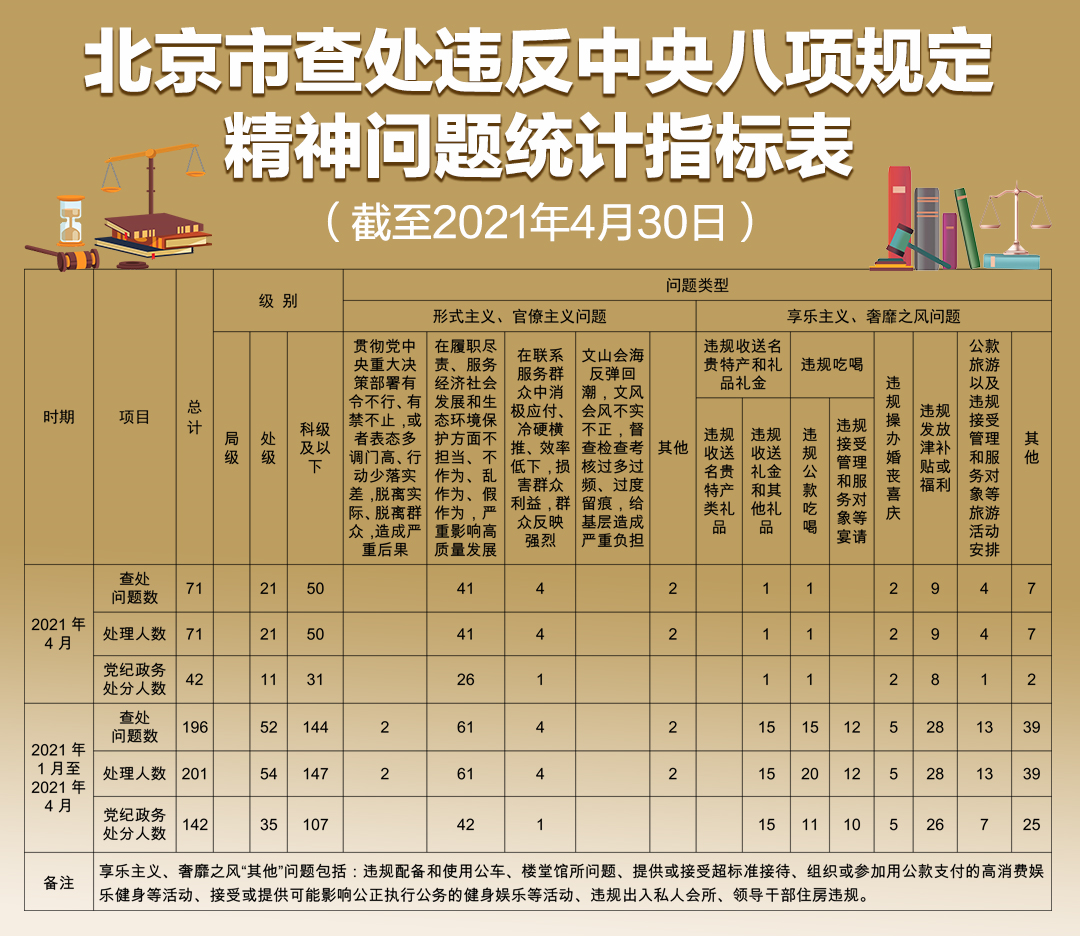 日前,市纪委监委公布今年1月至4月查处违反中央八项规定精神问题统计指标表。截至4月30日,本市累计查处违反中央八项规定精神问题196起,处理201人,其中处级54人、科级及以下147人。