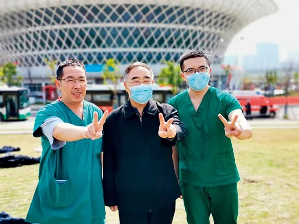 张伯礼和儿子张磊(左一)、侄子张硕(右一)在江夏方舱医院门口。