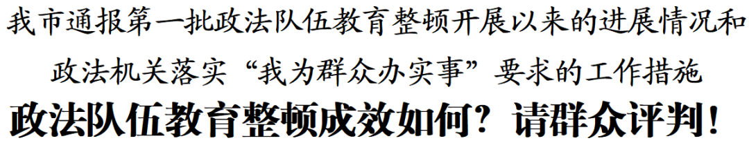 5月31日上午 在市政府新闻发布大厅 召开我市第一批政法队伍教育整顿新闻发布会 市委政法委分管日常工作的副书记、市政法队伍教育整顿领导小组办公室主任张亮,市高级人民法院党组成员、政治部主任、市教整办副主任黄国华,市人民检察院党组成员、政治部主任、市教整办副主任王德群,市公安局党委委员、政治部主任、市教整办副主任周思远,市司法局党委委员、政治部主任景涛参加并回答记者提问。 张亮同志介绍 这次教育整顿自下而上在我市分两批进行,第一批为区级党委政法委和区级政法单位,以及全市各监狱、戒毒所,从2月底开始至6月底基本结束。第二批为市委政法委、市政法各单位,从8月开始至10月底基本结束。教育整顿共分:学习教育、查纠整改、总结提升“三个环节”。4月8日,我市第一批教育整顿从学习教育环节转入了查纠整改环节,目前,查纠整改环节正处在关键阶段。 教育整顿启动后,市区两级党委坚决扛起主体责任,组建6个市级指导组和1个监狱戒毒专项工作组,全方位、全过程开展督导指导,确保各项工作任务落地落实。 在学习教育环节,紧扣忠诚、纯洁、可靠的根本要求,以领导带头先学、网络答题促学、专家辅导精学、现场参观研学等“八学”方式,统筹推进政治、党史、警示、英模“四项教育”,促进广大基层干警的忠诚思想根基进一步筑牢、纪法意识进一步强化、干事创业动力进一步激发。 在查纠整改环节,紧盯清除害群之马、整治顽瘴痼疾“两大任务”,3.5万余名政法干警深入开展自查自纠;对2018年以来的6万余件执法司法案件全面进行自查,市教育整顿办对10件重点问题线索进行挂牌督办,市级政法单位、各区教育整顿办对85件重点问题线索进行挂牌督办,一批害群之马受到严惩。紧紧扭住顽瘴痼疾整治遇到的痛点堵点问题,2569个执法司法问题得到有效整治,建立健全483个制度机制,一批顽瘴痼疾得到深入排查整治。 张亮同志还介绍了我市政法机关 落实“我为群众办实事”要求的十二条工作措施 一、积极推动涉法涉诉信访积案化解 建立健全涉法涉诉案件听证制度,实行政法系统处级以上领导干部“三包一保”(包案件、包查办、包结案、保稳定)制度,推动化解一批重大疑难信访案件,进一步提高执法司法公信力。 二、深入开展未办结案件攻坚 深化“有案不立、压案不查、有罪不究”问题专项整治,集中突破一批立案难、破案难、执行难、发还难案件。掀起“万兴三问”和端正执法司法理念大讨论活动的热潮,教育干警办好每一起小案件、解决好每一起小纠纷,真正让人民群众在每一起案件办理、每一件事情处理中都感受到公平正义。 三、坚决打击突出违法犯罪 常态化开展扫黑除恶,专项打击整治人民群众反映强烈的电信网络诈骗和黄赌毒、盗抢骗,以及食品、药品、生态环境等领域的犯罪,切实维护人民群众生命和财产安全。 四、组织开展法治宣传服务“五进”活动 广泛建立“社区法律工作室”,加快推进“一村一法律顾问”建设,组织政法干警进企业、进社区、进村居、进学校、进单位,采取以案释法、模拟法庭、法治讲座等措施,引导群众自觉守法、遇事找法、解决问题靠法。 五、积极推进矛盾纠纷源头化解 加强全市三级社会矛盾纠纷调处化解中心信息化、规范化建设,实行行政调解、司法调解、人民调解联动,综合运用诉调、访调、公调、检调、律调等方式,加强矛盾纠纷依法化解、多元化解、源头化解。 六、健全完善“每月当一天网格员”制度 组织政法干警每月利用一天时间深入社区、村居,以网格员身份开展入户走访,了解群众所思所想所急所盼,帮助群众解决实际问题。 七、加快智慧平安社区建设 全面创建平安社区,加大社区治乱、保安全力度,推动解决群众停车难、消防安全隐患等突出问题,让群众安全更有保障、生活更有尊严。2021年完成全市3300个智慧平安社区建设任务。 八、认真落实政法英烈家属、 见义勇为英雄及其亲属帮扶政策 认真落实政法英烈家属、见义勇为英雄及其亲属帮扶政策。定期走访慰问政法英烈家属、见义勇为英雄及其亲属,实施精准帮扶,切实为他们办实事解难事。 九、大力营造法治化营商环境 持续打击非法集资、虚开骗税、地下钱庄等犯罪活动。推动解决一批涉企积案、挂案,依法维护企业合法权益。严厉打击“假冒伪劣”等涉知识产权违法犯罪活动,出台一批加强新领域新业态知识产权保护制度,为构建新发展格局打造法治引擎。 十、着力加强对特殊人群的关爱力度 着力加强对特殊人群的关爱力度。建立健全多元救助机制,严格落实诉讼费缓交、免交政策。开通诉讼服务绿色通道,为老年人、残疾人、军人等提供诉讼服务。加强对中小学、幼儿园、医院的安全保护,切实筑牢校园、医院安全屏障。 十一、不断优化政法工作考核评价标准 把群众满意率和服判息诉率上升、涉法涉诉信访上访率下降纳入政法工作重要考核评价标准,拒绝接受当事群众任何名义、任何方式赠送的锦旗、感谢信,真诚为民服务,切实为民减负。 十二、集中推出一批便民利民措施 市级政法机关结合本系统实际,进一步强化执法司法领域“放管服”改革,细化完善出台一批优质高效的法律服务事项。深入开展作风整治,让群众办事不难、办证不烦,做到办案、办事不求