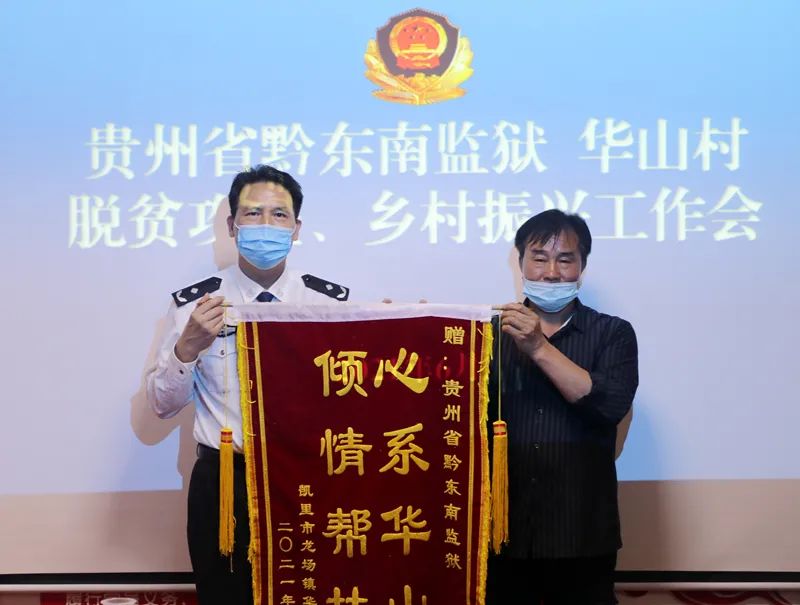 6月2日,凯里市龙场镇华山村村支两委一行4人冒着大雨专程来到黔东南监狱,送上一面绣有“心系华山倾情帮扶”的锦旗,向黔东南监狱为华山村脱贫攻坚和乡村振兴工作中为村民办实事、做好事、解难事的真情实意帮扶表达最诚挚的感谢。 “请你们一定收下这面锦旗,这是我们全村村民的一片心意。华山村在黔东南监狱等帮扶单位的多年扶持下,村容村貌和村民收入在6年多的扶贫工作中发生了翻天覆地的变化,实现了脱贫攻坚的艰巨任务!”华山村支委委员龙启军对监狱党委书记、监狱长潘盛华感谢说道。 “这是对我们帮扶工作的认可和肯定,更是激励。”接过锦旗,潘盛华监狱长表示,他说:虽然监狱派驻的驻村书记已撤回,但监狱在今后仍然一如既往尽职尽责帮助华山村做好乡村振兴工作,继续用心、用情、用力帮扶华山村的美丽乡村建设。 在交流座谈会上,华山村村支两委还为原黔东南监狱驻华山村第一书记金方庆送上绣有“心系于民服务于民”的锦旗,以表达华山村对监狱驻村第一书记金方庆三年驻村帮扶工作的真诚真心感谢。监狱部分领导班子成员、定点帮扶党支部负责人与华山村村支两委就监狱今后继续帮助华山村巩固脱贫成果,助力乡村振兴工作开展了座谈。 据了解,自脱贫攻坚战打响以来,黔东南监狱认真贯彻落实上级扶贫工作要求,曾派出两人驻村第一书记在对华山村对口帮扶的6年多里,监狱班子成员多次到帮扶点调研扶贫工作,先后投资数十万元为该村建起了文化广场、村民小组公示栏、党建活动室、购置办公电脑、绿化植被、改善村支两委办公环境、购置灭火器、添置消防宣传展板、发展种养殖产业等,帮助村民销售、收购蔬菜的等农副产品3万余公斤,价值数十万元,为村民稳定增收提供长期保证。此外,监狱各支部民警还结对帮扶30余户贫困户,并定期走访慰问解决实际困难,受到了该村村民的一致好评。