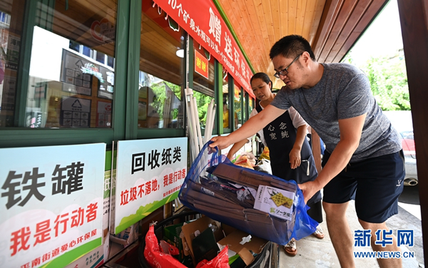 2020年8月25日,居民将生活垃圾送到海口市美兰区和平南街道爱心环保屋,用垃圾换取纸巾、肥皂等生活用品。新华社记者郭程摄