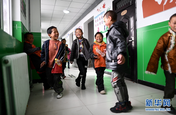 2021年3月26日,青海玛多县民族寄宿制中学二年级的学生在课间玩耍。该校目前采用清洁取暖方式,学生的学习和生活环境大为改善。新华社记者 张宏祥 摄