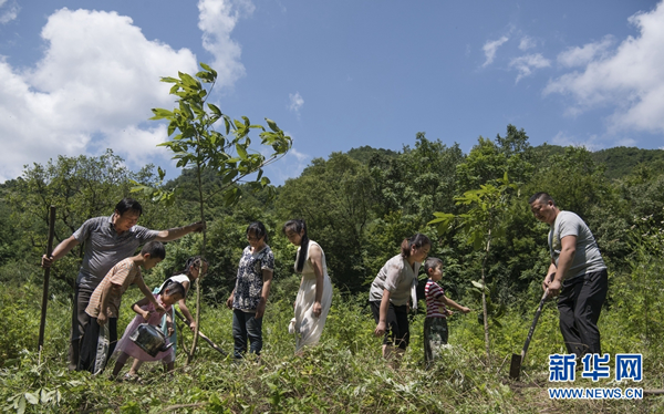 姚祖元(右一)与家人一起种树(2019年7月13日摄)。在秦岭深处的陕西省汉中市留坝县火烧店镇,姚家五代人历时70年深耕秦岭的故事在当地家喻户晓,传为佳话。新华社记者 陶明 摄