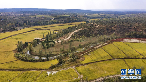 2020年9月26日拍摄的陕西省靖边县黄蒿界镇马季沟村稻田(无人机照片)。近年来,靖边县实施了“三北”防护林、退耕还林、流域治理等生态建设工程,北部沙漠区裸露明沙完全消失,中部农田林网蔚然成荫,南部山区夏季绿色满山。新华社记者 陶明 摄