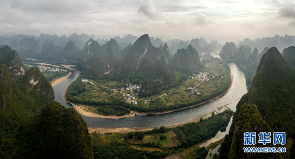 这是2018年10月18日拍摄的广西桂林阳朔县兴坪镇的漓江景色(无人机拼接照片)。新华社记者 李鑫 摄