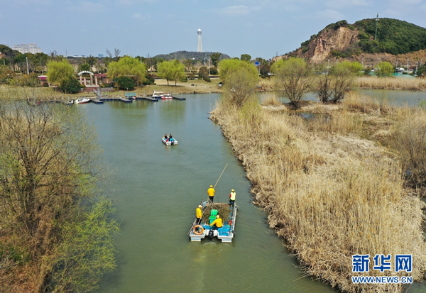 2021年2月24日,浙江湖州吴兴区八里店镇移沿山村河长带队在移沿山村开展巡河、保洁作业(无人机照片)。新华社记者 翁忻旸 摄