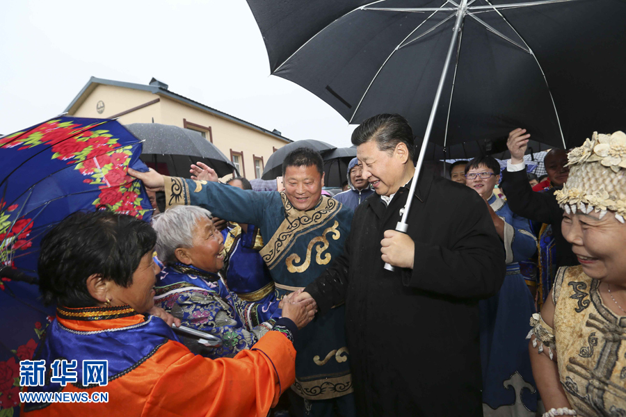 这是2016年5月24日下午,习近平在佳木斯市同江市八岔赫哲族乡八岔村冒雨与村民们交谈。新华社记者 兰红光 摄